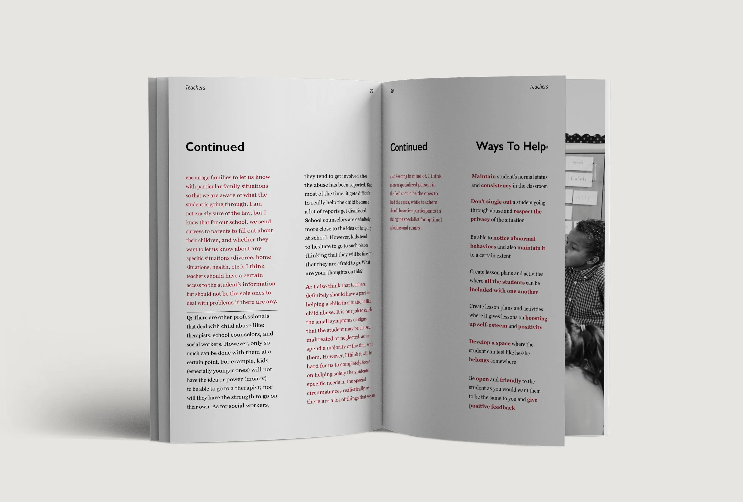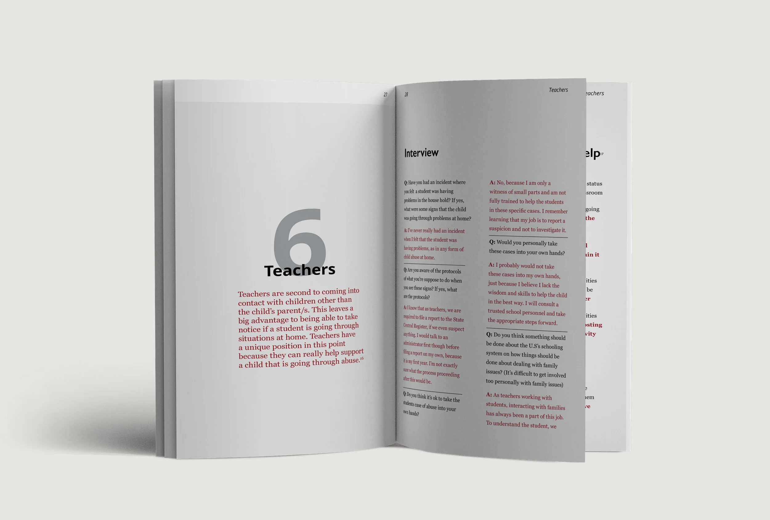 Towards the end of the compendium, it goes into depth on how teachers, social workers, school counselors, therapists and pediatricians can be of help when they see a child being abused in any way.